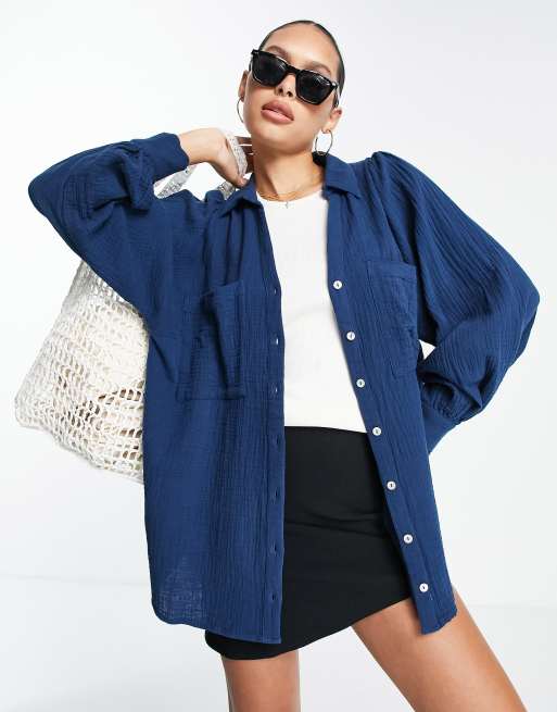 Topshop – Lässige, langärmlige Hemdbluse aus dunklem Chambray