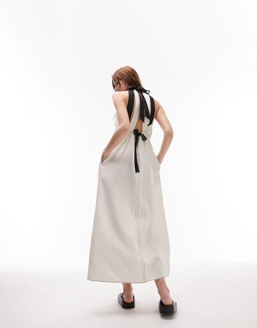 Topshop – Leinen-Maxikleid zum Hineinschlüpfen in Elfenbeinweiß mit kontrastierendem Bindedetail