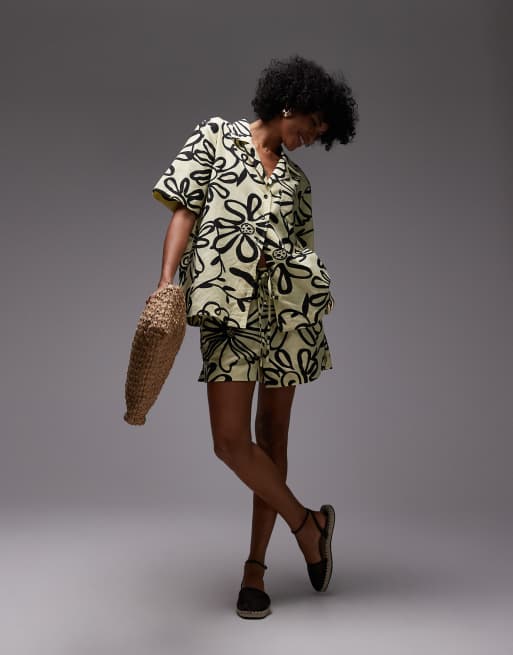 Topshop – Leinen-Shorts in gemustertem leuchtendem Gelb mit hohem Bund und Kordelzug, Kombiteil