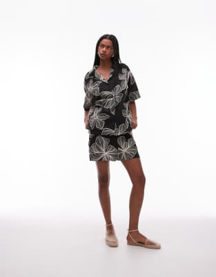 Topshop – Leinen-Shorts in Schwarz-Weiß mit floralen Ziernähten, Kombiteil