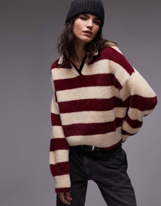 Topshop – Lockeres flauschiges Strick-Poloshirt mit Streifen in Burgunderrot und Ecru