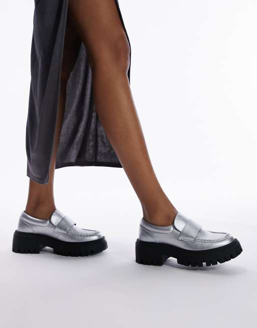 Topshop – Lottie – Loafer in Silber mit dicker Sohle