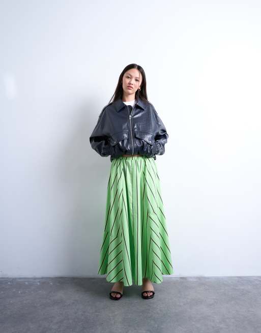 Topshop – Midi-Tellerrock aus Popeline in grün und gelb gestreift mit elastischem Bund