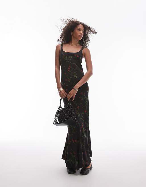 Topshop – Midi-Trägerkleid mit dunklem Blumenmuster und ausgestelltem Saum