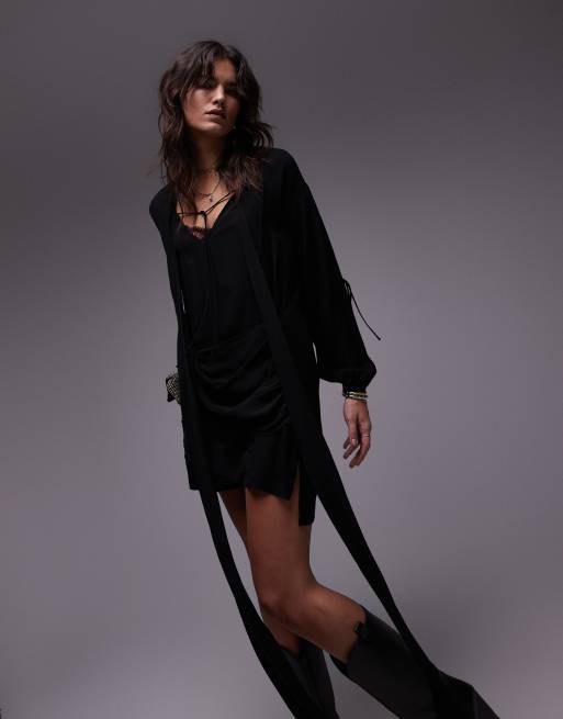 Topshop – Mini-Hemdblusenkleid in Schwarz mit langer Drapierung