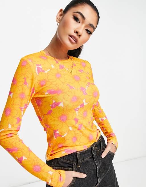 Topshop – Netzstoff-Oberteil in Orange mit Blumenmuster