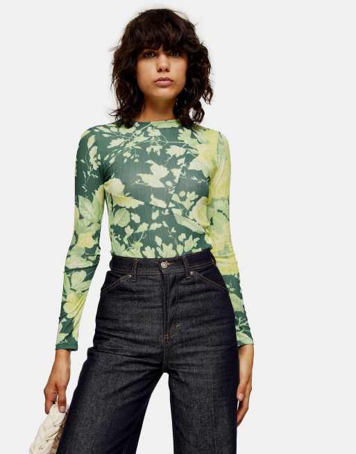Topshop – Oberteil in Grün aus Netzstoff mit Blumenprint