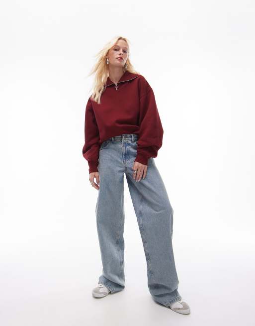 Topshop – Oversize-Pullover in Burgunderrot mit kurzem Reißverschluss