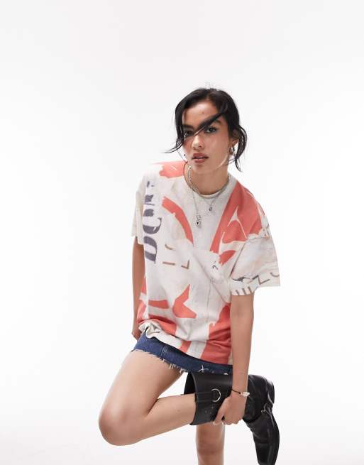 Topshop – Oversize-T-Shirt in Rot und Weiß mit All-over-Print