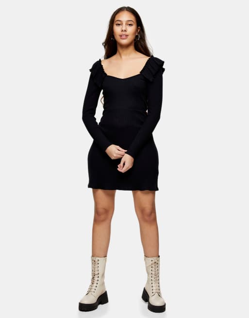 Topshop Petite – Mini-Skaterkleid mit Rüschen in Schwarz