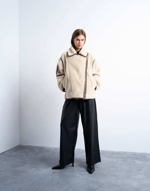 Topshop – Piloten-Jacke in Creme aus Teddyfell mit Oversize-Passform