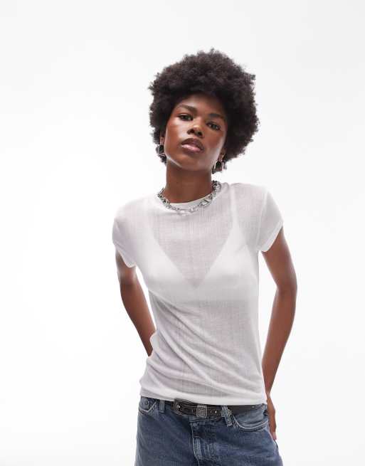 Topshop – Premium – Geripptes, durchscheinendes Longline-T-Shirt in Weiß
