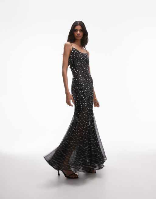 Topshop – Premium – Maxikleid mit schwarz-weißem Punktemuster und Godet-Saum aus Stoffmix