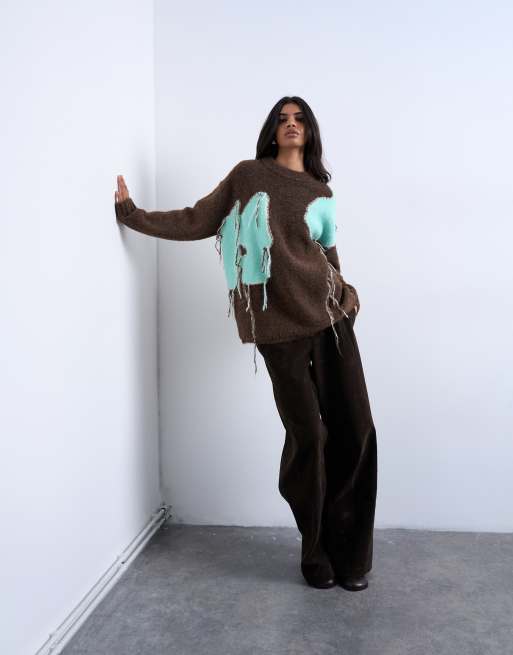 Topshop – Pullover in Schokobraun mit platziertem Blumen-Fransen-Design
