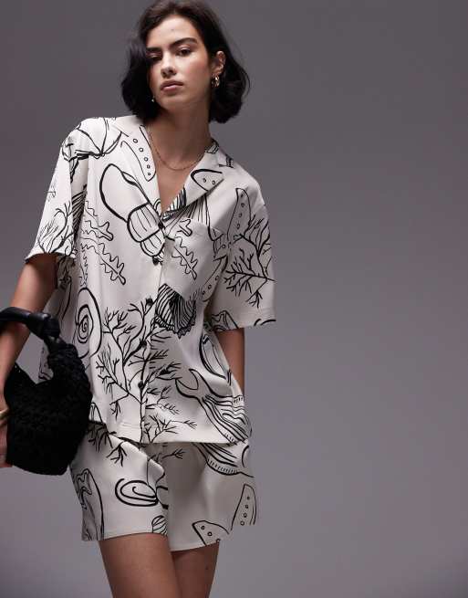 Topshop – Satin-Hemdbluse in Ecru mit Muschelmuster, Kombiteil