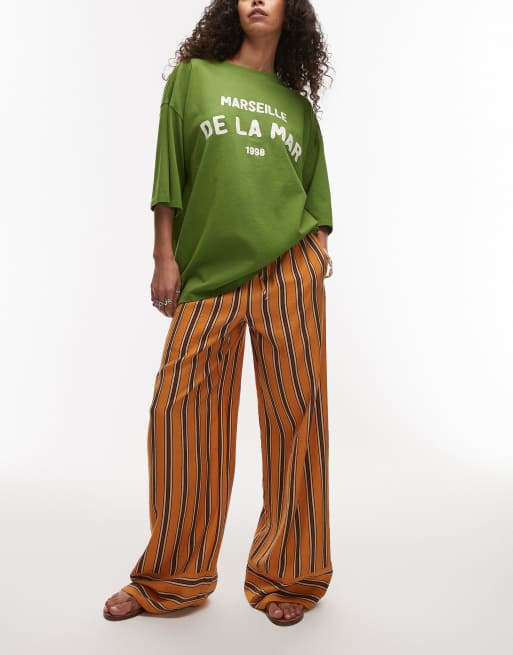 Topshop – Satin-Hose mit geradem Schnitt und Streifen in Orange und Schokobraun