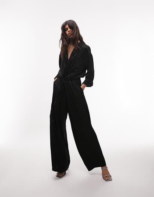 Topshop – Satin-Jumpsuit in Schwarz mit Knopfleiste