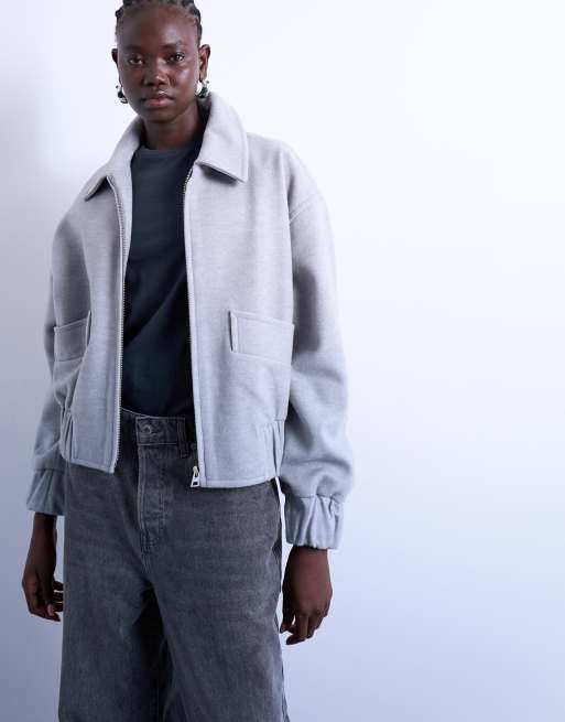 Topshop – Schlichte Cropped-Bomberjacke in Hellgrau mit Wollanteil und Steppfutter