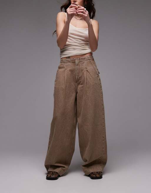 Topshop – Schlichte Jeans in Sand mit Biesen und weitem Bein