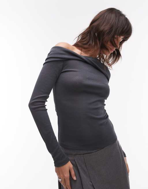 Topshop – Schulterfreies Oberteil in Grau mit verdrehtem Design