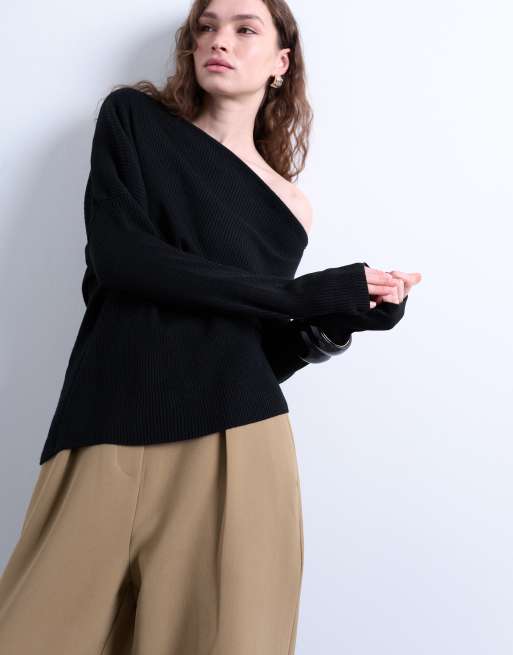Topshop – Schulterfreies Stricktop in Schwarz