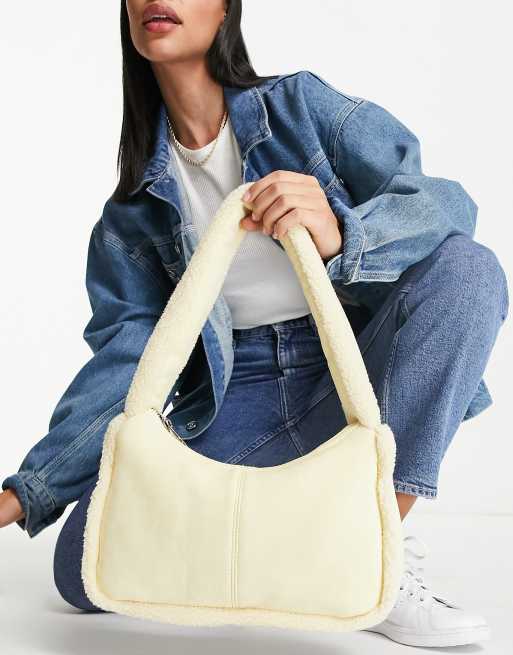 Topshop – Schultertasche in Creme mit Teddyfellkanten