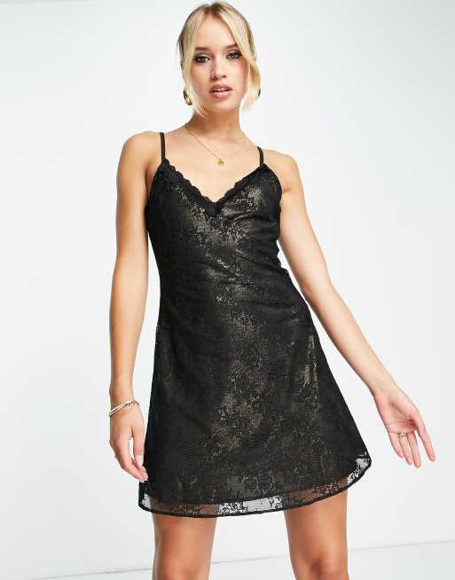 Topshop – Schwingendes Mini-Trägerkleid mit Spitze in Schwarz und Futter in Gold-Metallic-Optik
