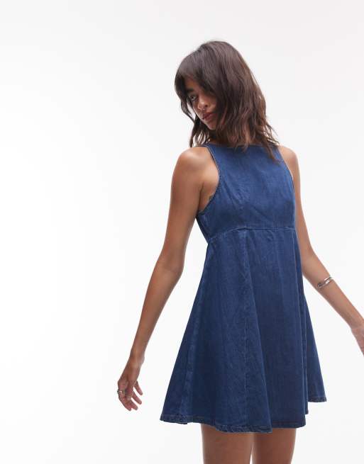 Topshop – Schwingendes Minikleid aus Denim in Mittelblau mit U-Boot-Ausschnitt