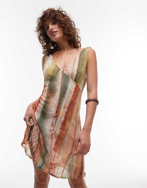 Topshop – Schwingendes Minikleid aus Netzstoff mit Knitterstruktur, buntem Print und V-Ausschnitt