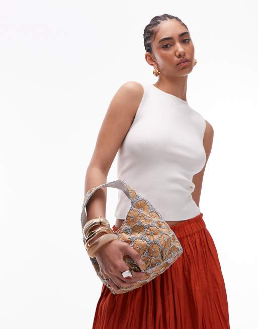 Topshop – Sindri – Tasche in Natur und Silber mit Blumenverzierung