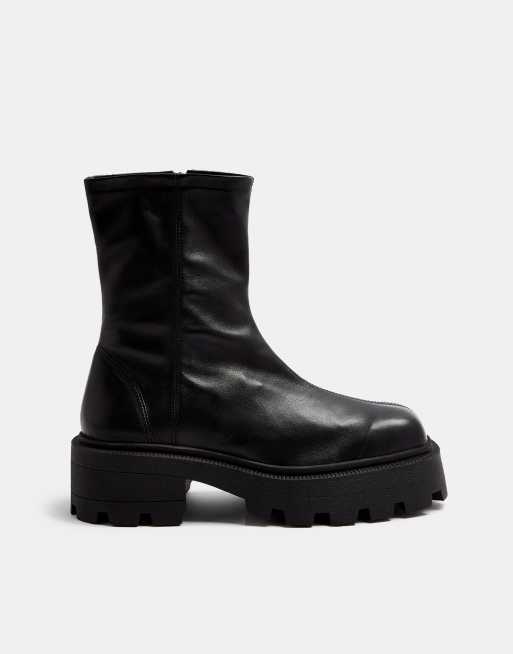 Topshop – Sock-Boots aus schwarzem Leder mit eckiger Zehenpartie und dicker Sohle