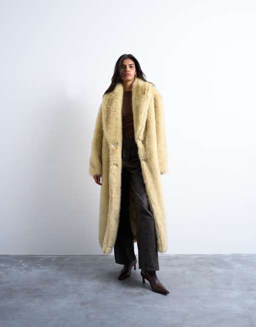 Topshop – Superlanger Mantel aus Kunstpelz in Buttermilch mit Schalkragen