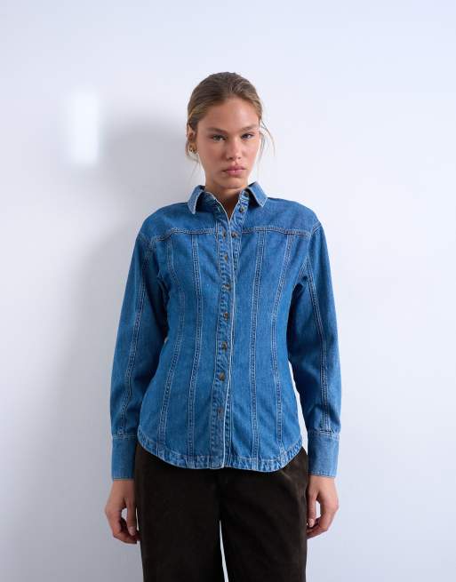 Topshop – Taillierte Jeansbluse in Mittelblau mit Nahtdetail
