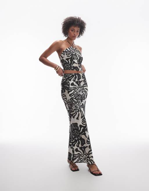 Topshop Tall – Maxirock aus Twill-Satin mit Bias-Cut und verwischtem Farnmuster in Schwarz-Weiß, Kombiteil