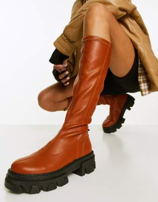 Topshop – Tate – Kniehohe Stiefel in Hellbraun mit dicker Sohle