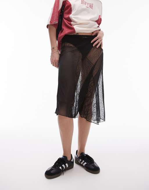 Topshop – Transparenter Rock in Schwarz in 90er-Länge aus genopptem Netzstoff mit Bahnen-Design