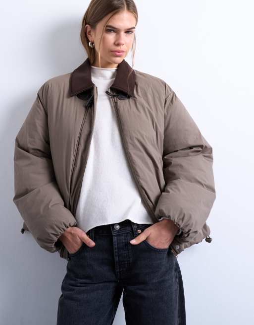 Topshop – Wattierter Nylon-Kurzmantel in Khaki mit Kontrastkragen aus Wildlederimitat