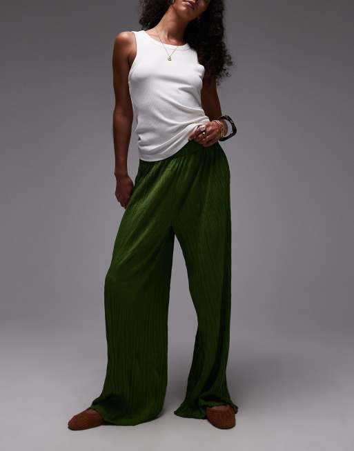 Topshop – Weit geschnittene Hose in Olivgrün mit Knitterstruktur