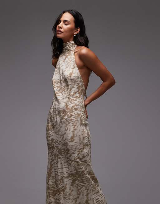 Topshop – Weites Neckholder-Midikleid in Beige mit abstraktem Zebramuster