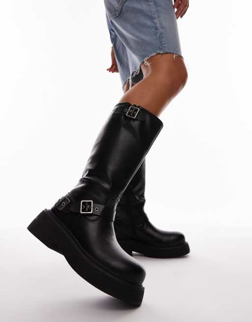 Topshop Wide Fit – Roy – Motorrad-Stiefel in Schwarz mit Metallbesatz und dicker Sohle