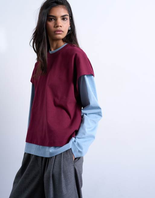Topshop – Zweilagiges Skater-T-Shirt in Blau und Burgunderrot
