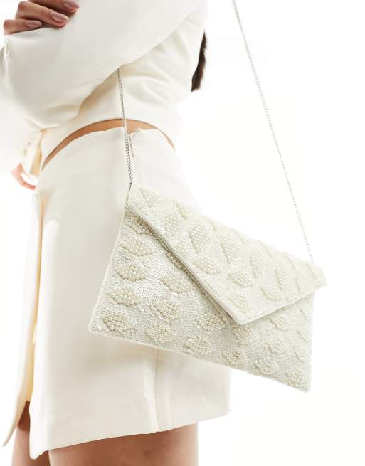 True Decadence – Kuvert-Clutch in Silber mit Perlenbesatz