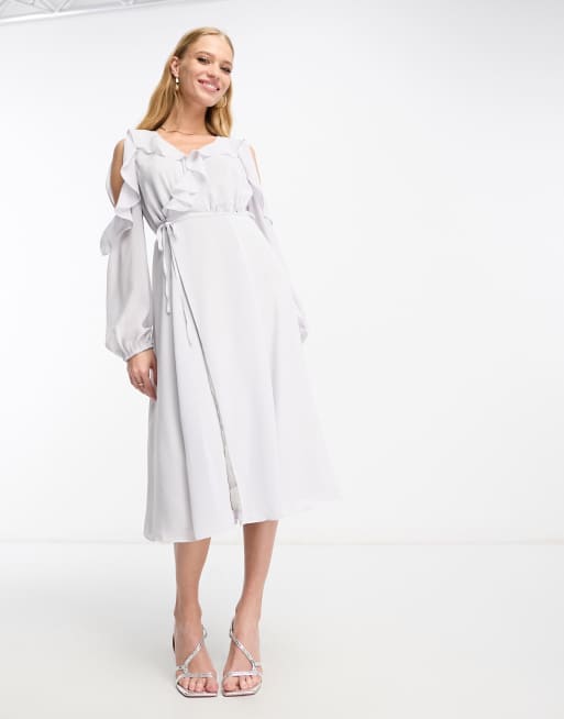 True Decadence – Langärmliges Kleid in Hellgrau mit Rüschen