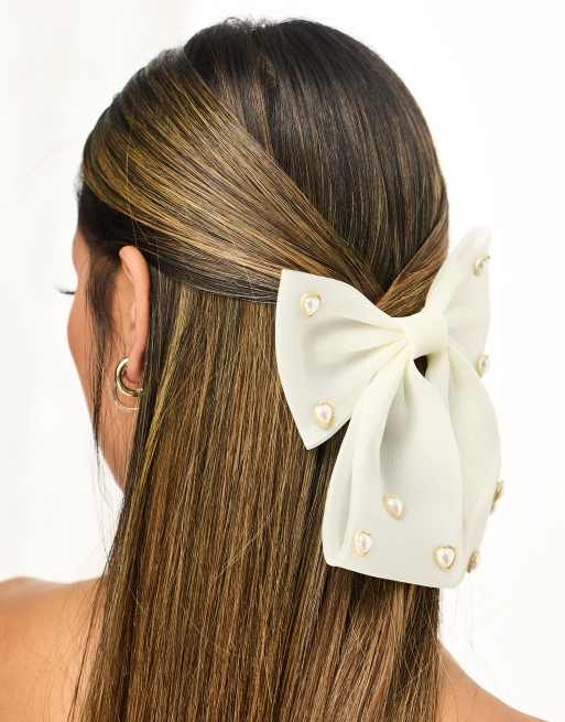 True Decadence – Übergroße Schleifen-Haarspange in Creme mit Perlenverzierung