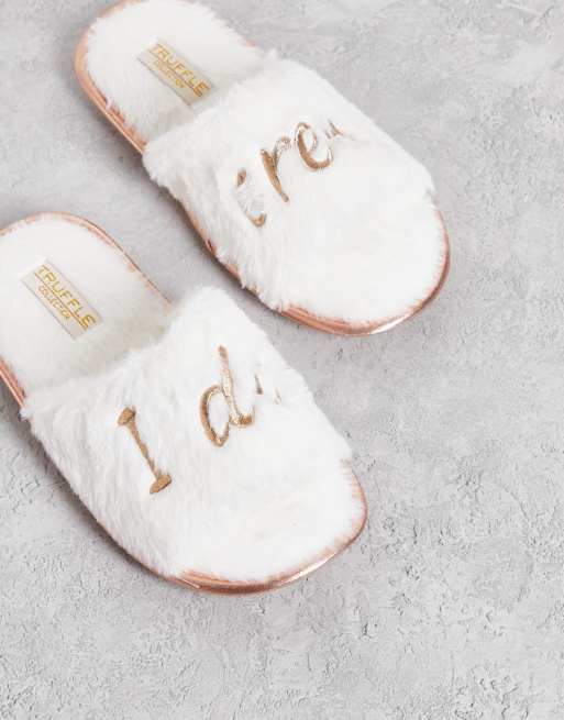 Truffle Collection – Bridal Party – Hausschuhe in Weiß mit „I Do Crew“-Text