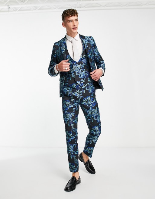 Twisted Tailor – Owsley – Anzug in Schwarz mit blaugrünem und mintfarbenem floralem Jacquard