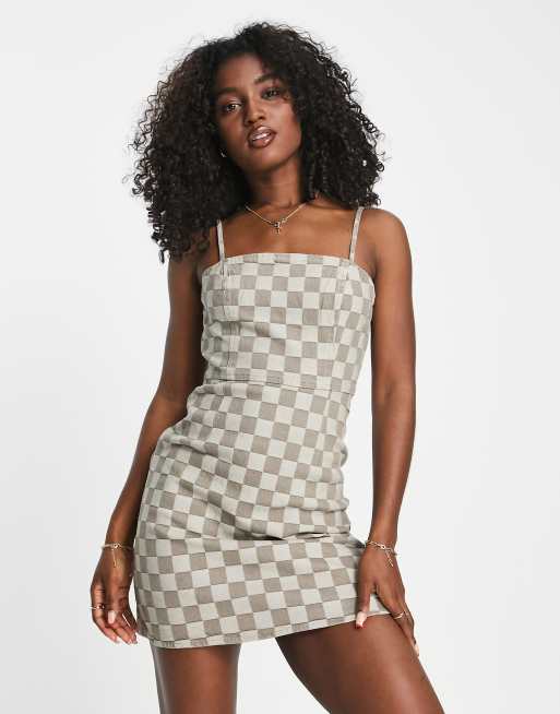 Urban Revivo – Kurzes, kariertes Jeanskleid in Beige