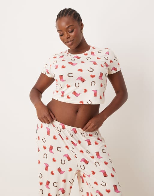 Urban Threads Curve – Polyester-Pyjama mit Cowboystiefel-Muster, aus T-Shirt und Hose