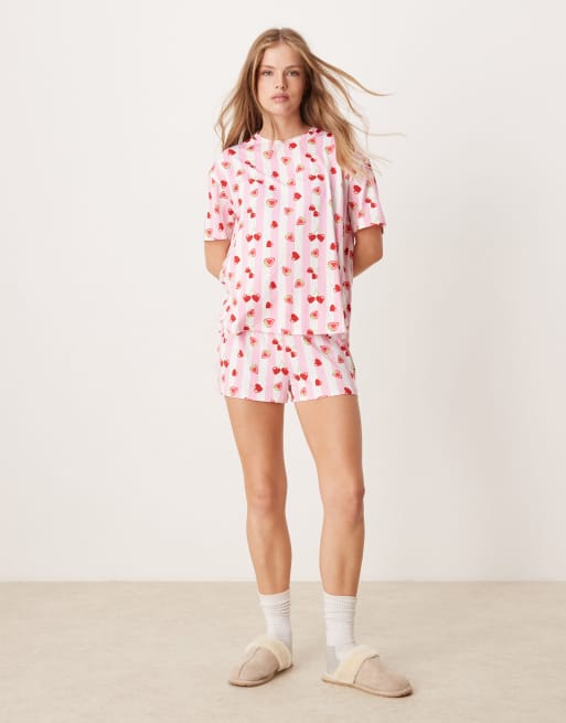 Urban Threads – Pyjama, bestehend aus kurzärmligem T-Shirt und Shorts, mit Herz-Kirsch-Streifenmuster in Beerenrot