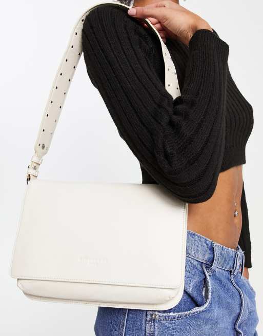 Urbancode – Schultertasche aus Leder in Creme mit Umschlag und nietenbesetztem Tragegurt